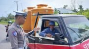 Dilokasi kegiatan terlihat Tim Satgas Preemtif Ops Keselamatan Telabang 2025 menyapa pengendara sembari membagikan brosur himbauan tertib berlalu lintas.