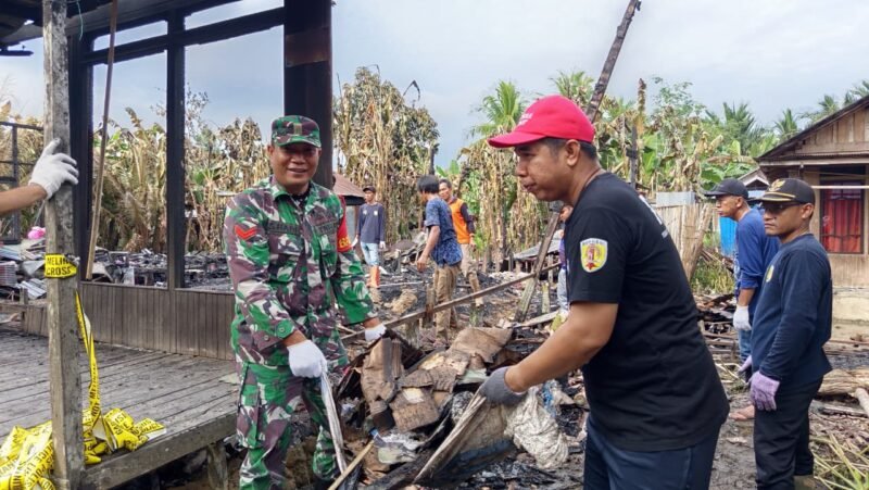 BARABAI – Babinsa Koramil 1002-06/Barabai bersama Bhabinkamtibmas, Dinas Lingkungan Hidup, aparat desa, Linmas, dan anggota BPD Desa Ayuang melaksanakan pembersihan puing-puing pascakebakaran rumah warga di RT 02 RW 01 Desa Ayuang, Kecamatan Barabai, Kabupaten Hulu Sungai Tengah, Jumat (07/11/2025).