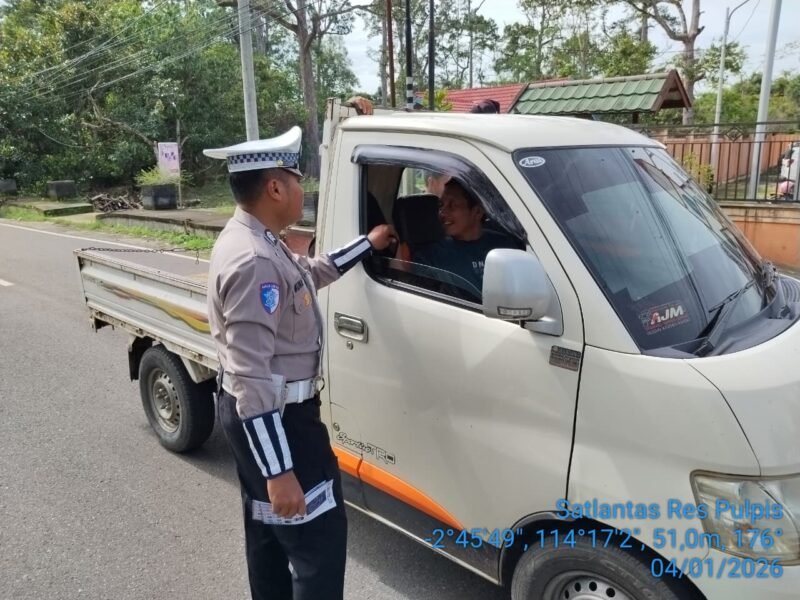Polres Pulang Pisau – Satuan Lalu Lintas – Personil Satlantas Polres Pulang Pisau memberikan imbauan kepada pengendara Roda 4 agar menggunakan sabuk pengaman (safety belt) Saat berkendara, Minggu, 4 Januari 2026.