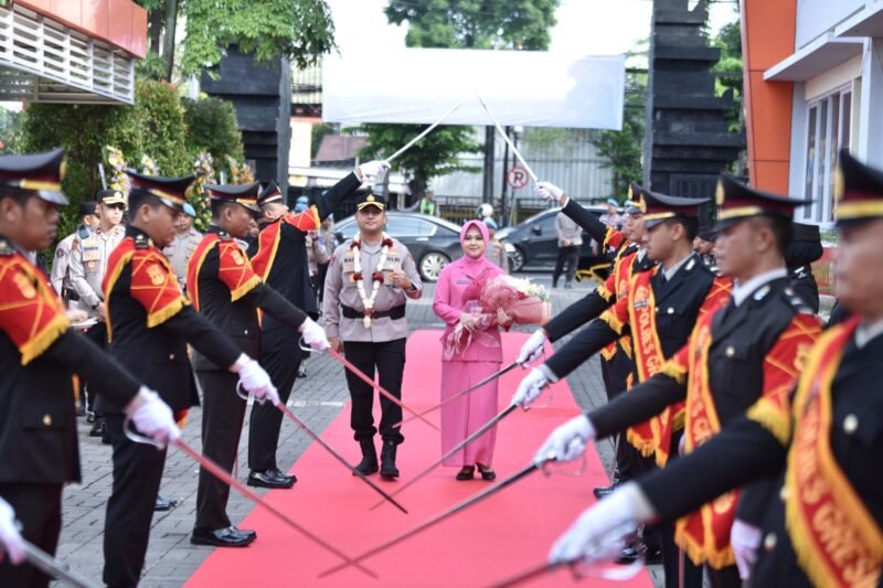 Didampingi istri, AKBP Ramadhan Nasution melangkah di bawah naungan pedang pora yang melambangkan doa dan harapan agar senantiasa diberikan perlindungan, kekuatan, serta kebijaksanaan dalam mengemban tugas sebagai Kapolres Gresik.