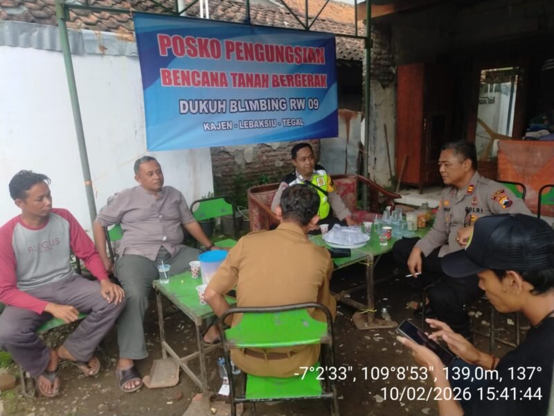 Tegal,TargetNews.id Aparat kepolisian dari Polsek Lebaksiu terus melakukan penanganan dan monitoring bencana alam tanah bergerak yang terjadi di Dukuh Blimbing RW 09, Desa Kajen, Kecamatan Lebaksiu, Kabupaten Tegal. Kegiatan pemantauan dilaksanakan pada Selasa (10/2/2026) pukul 20.00 WIB hingga 01.30 WIB guna memastikan keselamatan warga serta menjaga situasi tetap kondusif.