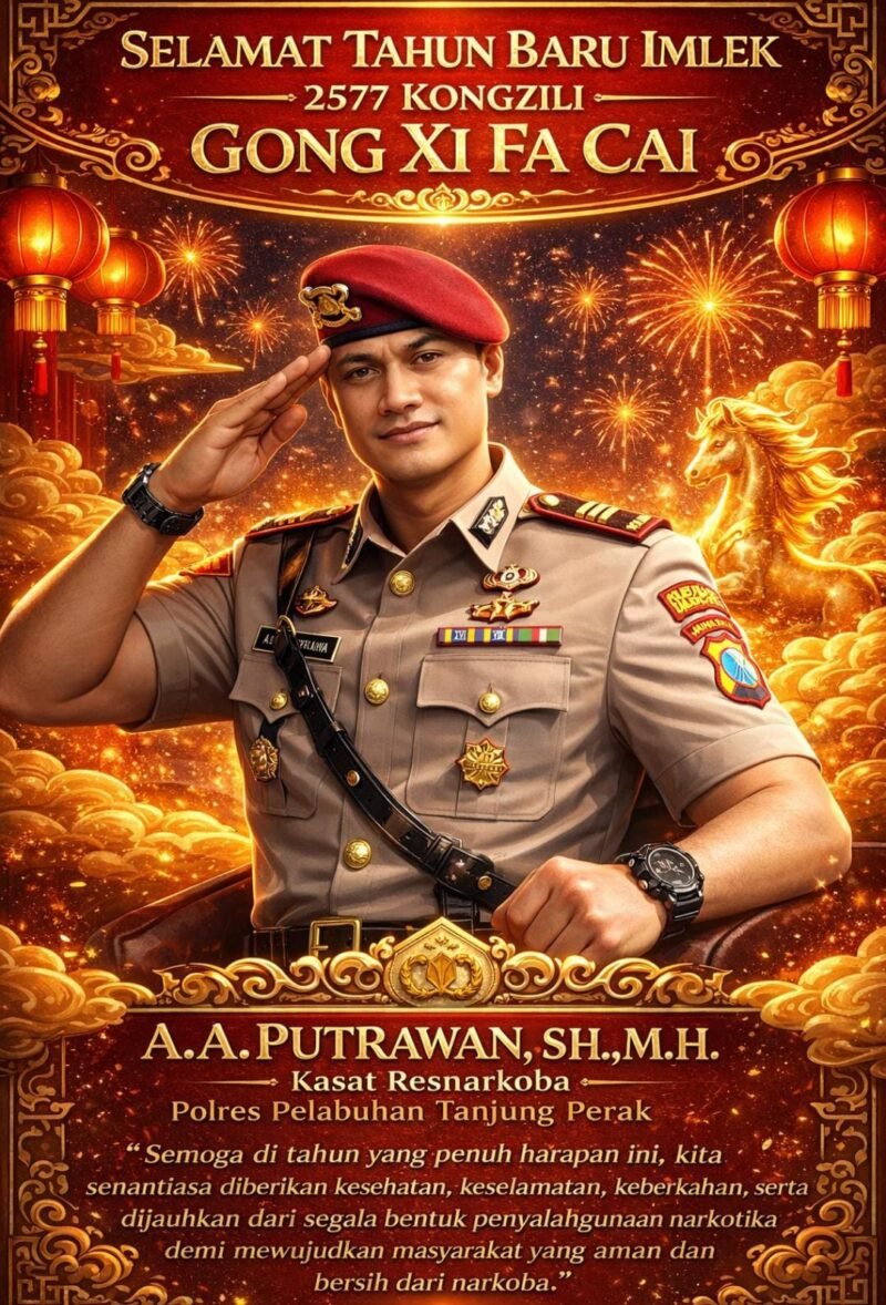 TARGETNEWS.ID Surabaya – Dalam semangat kebersamaan dan toleransi antarumat beragama, Kepala Satuan Reserse Narkoba Polres Pelabuhan Tanjung Perak, Agus Adik Putrawan, S.H., M.H., menyampaikan ucapan Selamat Tahun Baru Imlek 2557 Kongzili kepada seluruh masyarakat yang merayakan.