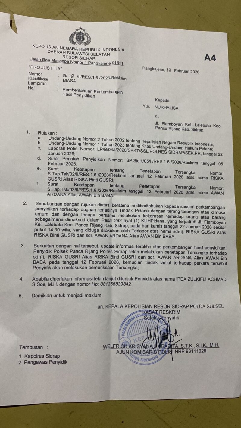 TARGETNEWS.ID SIDRAP Sulel – Penanganan kasus dugaan kekerasan yang menimpa Nurhalisa kini memasuki babak baru. Meski penyidik telah melakukan gelar perkara dan menetapkan pasangan suami istri (Pasutri) berinisial R/A sebagai tersangka, pihak korban menyayangkan belum adanya tindakan penahanan oleh pihak Kepolisian Sektor (Polsek) Panca Rijang, Polres Sidrap.
