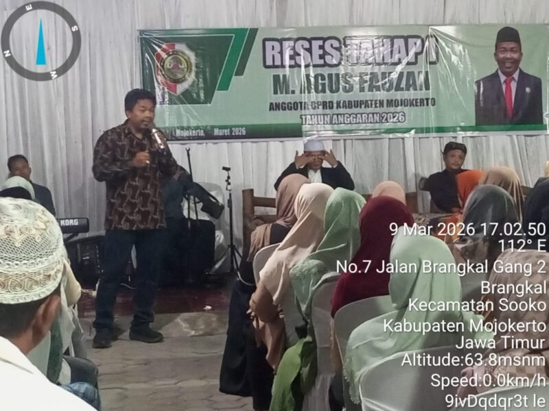 Mojokerto — TargetNews.id 9 Maret 2026 Anggota DPRD Kabupaten Mojokerto, M. Agus Fauzan menggelar kegiatan Reses I di Brangkal Gang 2, Dusun Brangkal, Desa Brangkal, Kecamatan Sooko, pada Senin. Kegiatan ini dihadiri sekitar 200 tamu undangan dari berbagai unsur masyarakat.