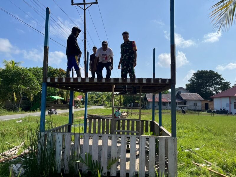 Sambas – Dalam upaya meningkatkan keamanan dan ketertiban lingkungan, Babinsa Desa Berlimang Koramil jajaran Kodim 1208/Sambas bersama warga melaksanakan kegiatan gotong royong merehabilitasi Pos Keamanan Lingkungan (Poskamling) di wilayah Desa Berlimang, Kecamatan Teluk Keramat,, Kabupaten Sambas, Sabtu (14/03/26).