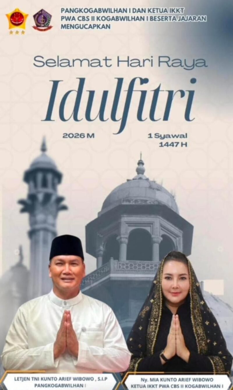 Jakarta – Menyambut Hari Raya Idulfitri 1 Syawal 1447 Hijriah, Panglima Komando Gabungan Wilayah Pertahanan (Pangkogabwilhan) I, Kunto Arief Wibowo, bersama Ketua IKKT PWA CBS II Kogabwilhan I, Mia Kunto Arief Wibowo, menyampaikan ucapan selamat kepada seluruh umat Muslim di Indonesia.