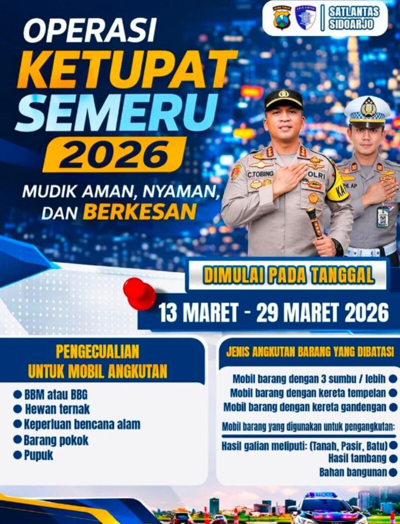 Sidoarjo – Dalam rangka menjaga keselamatan dan kelancaran arus mudik serta arus balik Lebaran, Satuan Lalu Lintas Polresta Sidoarjo menggelar Operasi Ketupat Semeru 2026 yang berlangsung mulai 13 Maret hingga 29 Maret 2026.
