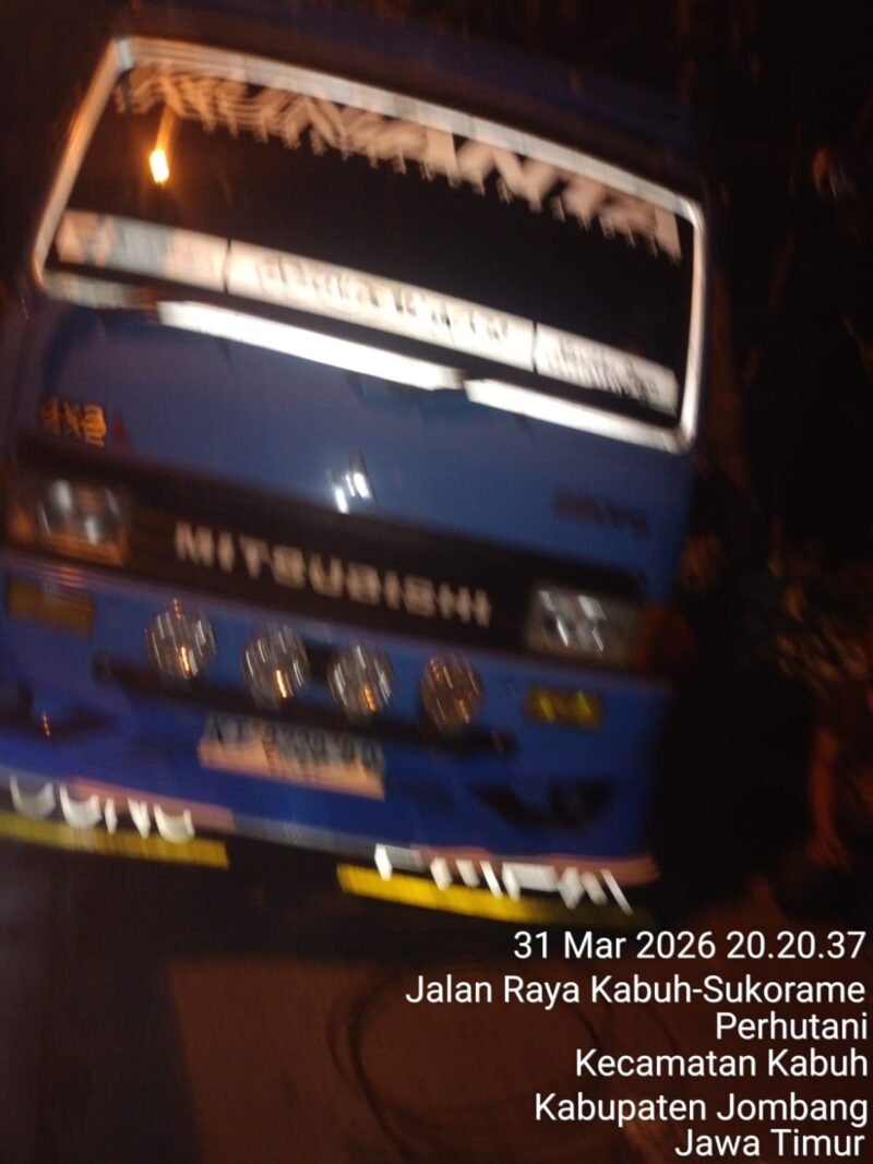 Jombang – Sebuah truk Mitsubishi mengalami oleng hingga melintang di badan Jalan Raya Kabuh–Sukorame, tepatnya di kawasan Perhutani, Kecamatan Kabuh, Kabupaten Jombang, Jawa Timur, Selasa malam ini (31/03/2026).