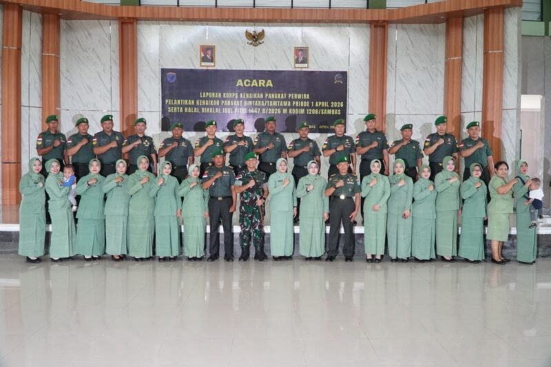 Sambas – Komandan Kodim (Dandim) 1208/Sambas Letkol Inf Dwiyanto Kusumo M. A. P, memimpin langsung kegiatan laporan korp kenaikan pangkat perwira serta pelantikan kenaikan pangkat bintara dan tamtama yang dirangkaikan dengan acara halal bihalal, bertempat di Aula Makodim 1208/Sambas Jalan Tabrani, Desa Lumbang, Kec. Sambas, Kab. Sambas, Rabu (01/04/26).