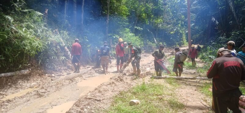 BARABAI – Babinsa Koramil 1002-01/Batang Alai Selatan, Serda Erli Sepriyanto bersama warga masyarakat Desa Atiran melaksanakan kegiatan gotong royong pembersihan jalan sepanjang kurang lebih 2,5 kilometer dalam rangka penyiapan instalasi program listrik desa, Selasa (7/4).