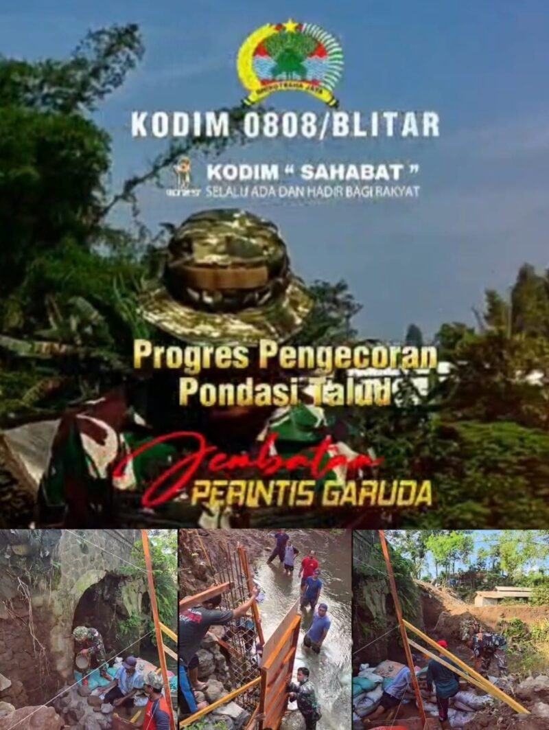BLITAR — Komando Distrik Militer Kodim 0808-Blitar terus menunjukkan kedekatannya dengan masyarakat melalui keterlibatan aktif dalam pembangunan infrastruktur desa. Hal ini terlihat dalam progres pembangunan Jembatan Perintis Garuda yang menghubungkan Desa Kebon Duren dan Desa Ponggok, Kecamatan Ponggok, Kabupaten Blitar.
