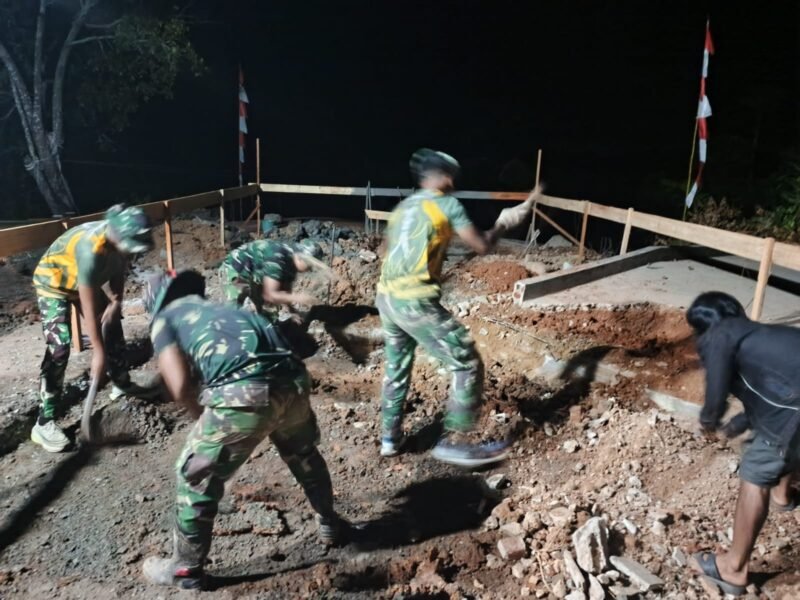 Dengan memanfaatkan penerangan seadanya, personel Kodim secara bergantian mengerjakan proses penggalian tempat pemasangan cakar ayam nantinya. Upaya ini dilakukan guna memastikan progres pembangunan tetap berjalan sesuai target yang telah direncanakan.