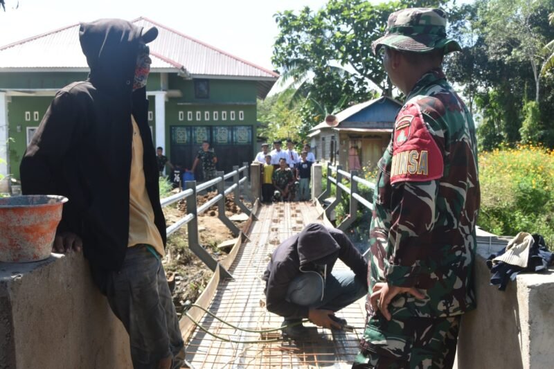 Terlihat di lapangan, anggota TNI bersama masyarakat bahu-membahu menyelesaikan pekerjaan konstruksi, mulai dari pemasangan rangka hingga pengecoran bagian penyangga jembatan. Semangat gotong royong menjadi kunci utama dalam percepatan pembangunan infrastruktur tersebut.
