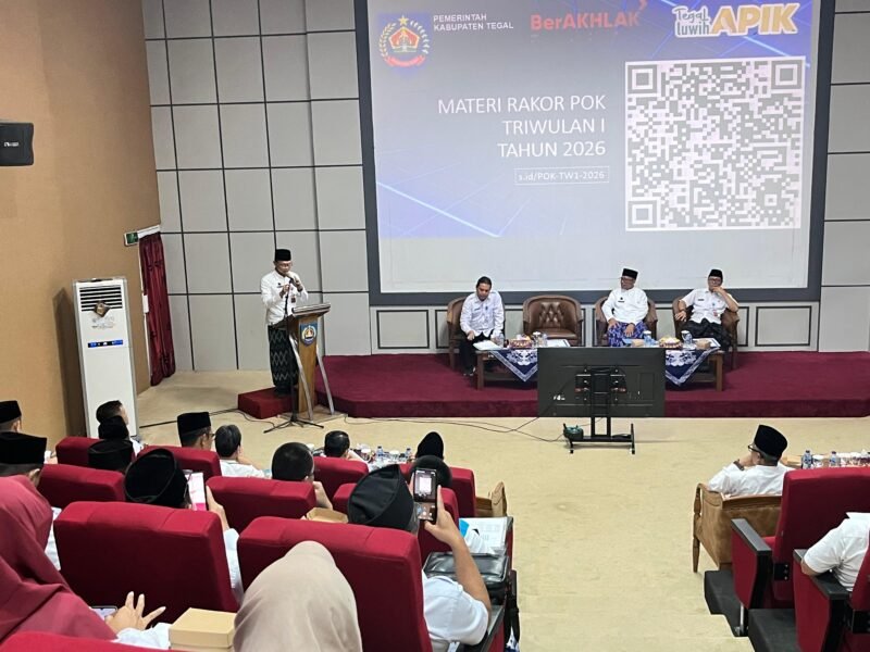 Slawi, TargetNews.id – Sekretaris Daerah Kabupaten Tegal Amir Makhmud mendorong seluruh Kepala Organisasi Perangkat Daerah (OPD) untuk mengoptimalkan pendapatan daerah dalam Rapat Koordinasi Pengendalian Operasional Kegiatan (POK) triwulan pertama tahun 2026. Kegiatan yang berlangsung di Gedung Dadali pada Rabu (22/04/2026). Rakor ini bertujuan mengevaluasi capaian kinerja serta memastikan penyerapan anggaran berjalan sesuai target yang telah ditetapkan.