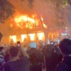 TargetNews.ID Surabaya Gedung Negara Grahadi, Surabaya, sisi barat terbakar pada Sabtu (30/8) malam dengan api terpantau…
